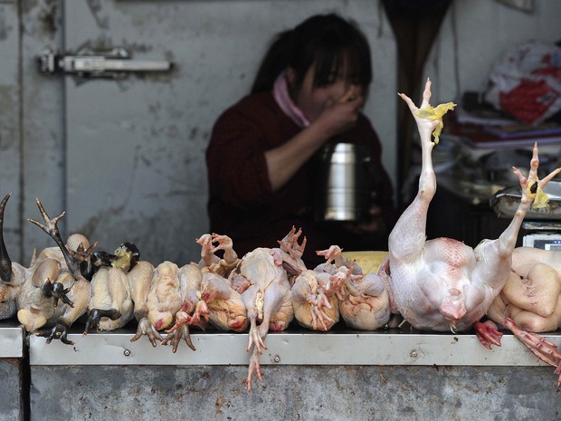 | Comerciante almoça enquanto espera por compradores em um açougue de Hefei, na China. Dois moradores de Xangai morreram no último mês após contraírem uma forma de gripe aviária que nunca havia sido registrada em humanos, segundo a agência Xinhua. (Foto: Reuters/Stringer) |